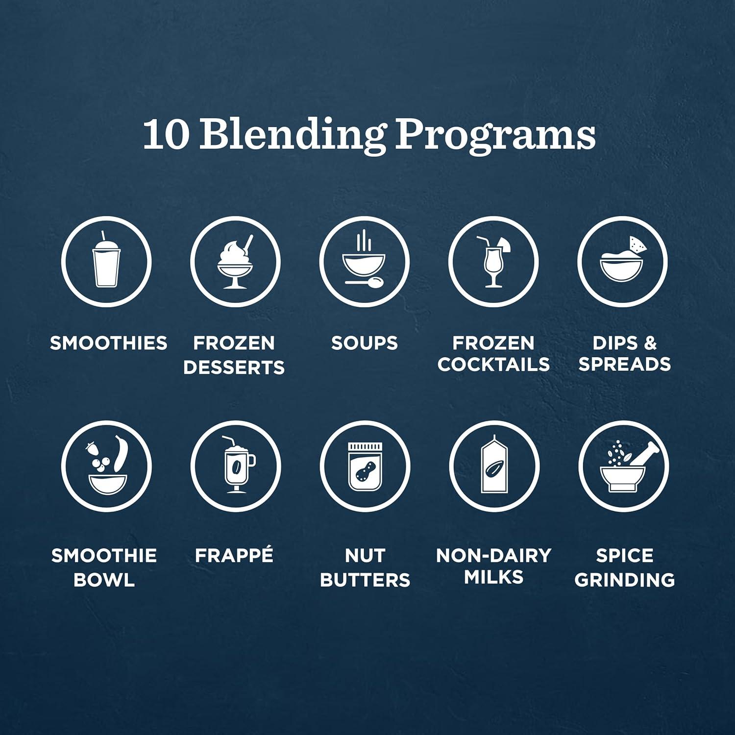 10 Blending Programs: 10 automatic Blending Programs for Smoothies, Frozen Desserts, Soups, Frozen Cocktails, Dips & Spreads, Smoothie Bowl, Frappé, Nut Butters, Non-Dairy Milks, and Spice Grinding